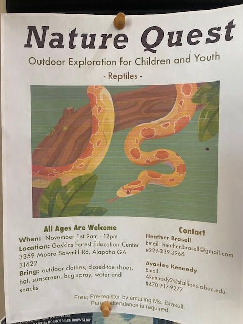 Nature Quest Outdoor Exploration for children and youth -Retiles- November 1, 2025 9am-12pm Location: Gaskins Forest Educational Center 3359 Moore Sawmill Rd. Bring: Outdoor clothes, closed-toe shoes, hat, sunscreen, bug spray, water and snacks. Contact: Heather Brasell Email: heather.brasell@gmail.com 1-229-339-3966 or Avanlee KEnnedy Email: Akennedy2@stallions.abac.edu 1-470-917-9277.